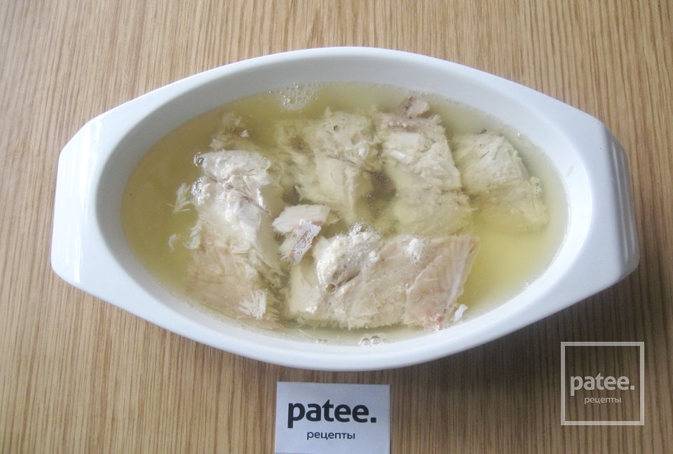 Из кастрюли достать филе скумбрии, а бульон процедить. Если рыба свежая, в том числе и мороженая, то бульон должен получится прозрачным, как слеза. Когда он варился, у меня на кухне даже не было запаха рыбы. А на вкус он похож на куриный.