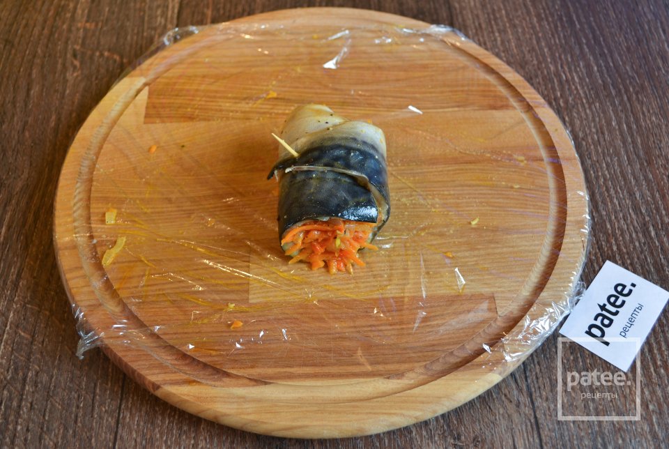 Сверните рулетом филе скумбрии к хвостовой части, подколите шпажкой, чтобы не развернулся рулет.