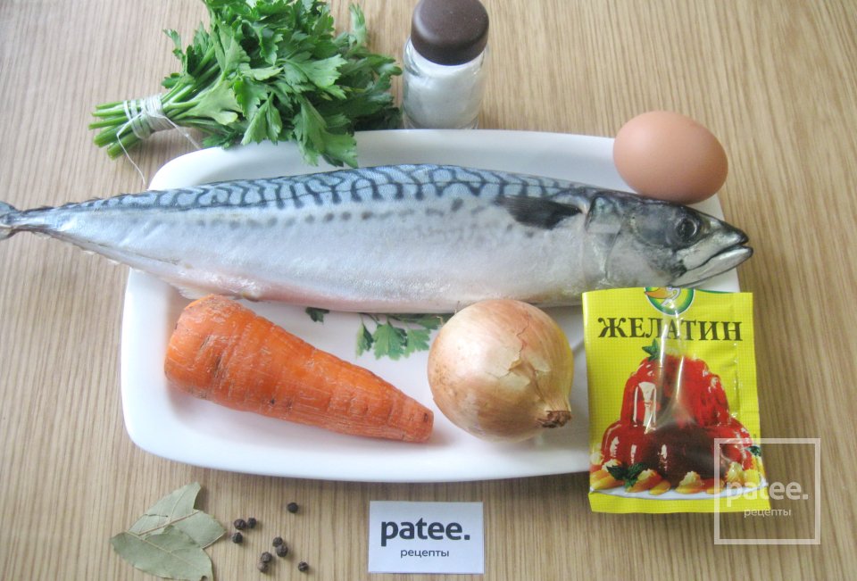 Для приготовления заливного из скумбрии потребуется: скумбрия свежая или мороженая, морковь, лук репчатый, петрушка, желатин, соль, лавровый лист, черный перец горошком, яйцо отварное для украшения.