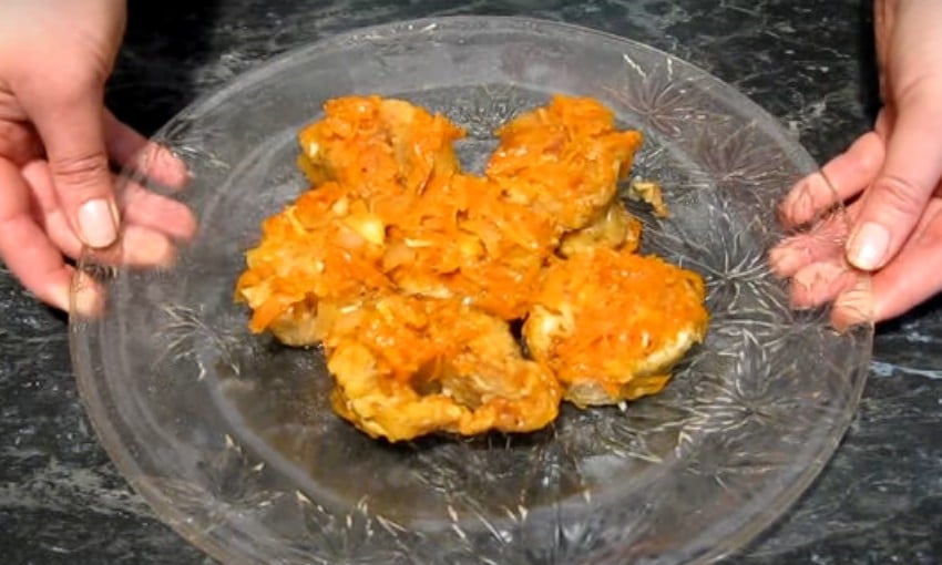 - Тушим до полуготовности. Вливаем 1 ст. холодной воды, накрываем крышкой и на медленном огне доводим до мягкости. Рыбу разрезаем на порционные куски.
