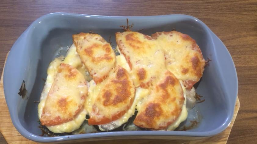 - Рыбу и картофель обильно поливаем приготовленным соусом. Ставим противень в духовку, разогретую до 200 °С, на 30 минут.
