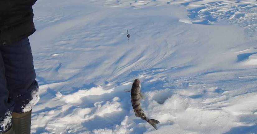 После опускания снасти, выбирается слабина лески так, чтобы кивок был слегка нагружен, после этого удочка устанавливается возле лунки и можно ждать поклевку.