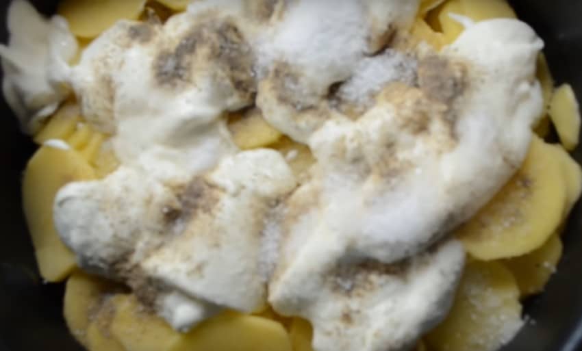 6. Верхним должен быть картофель, который тоже нужно смазать сметаной, посолить и поперчить.