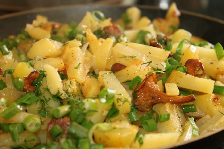- Время жарки грибов – около 20 минут, затем добавьте картофель, все тщательно перемешайте, залейте кипяток (либо же бульон).