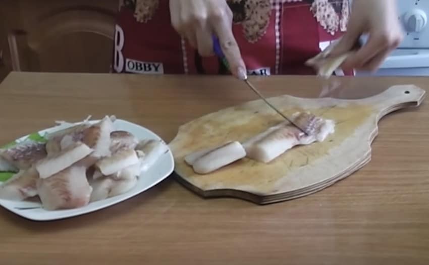 - Когда рыба разморозится, нарезать кусками любой желаемой формы и размера.
