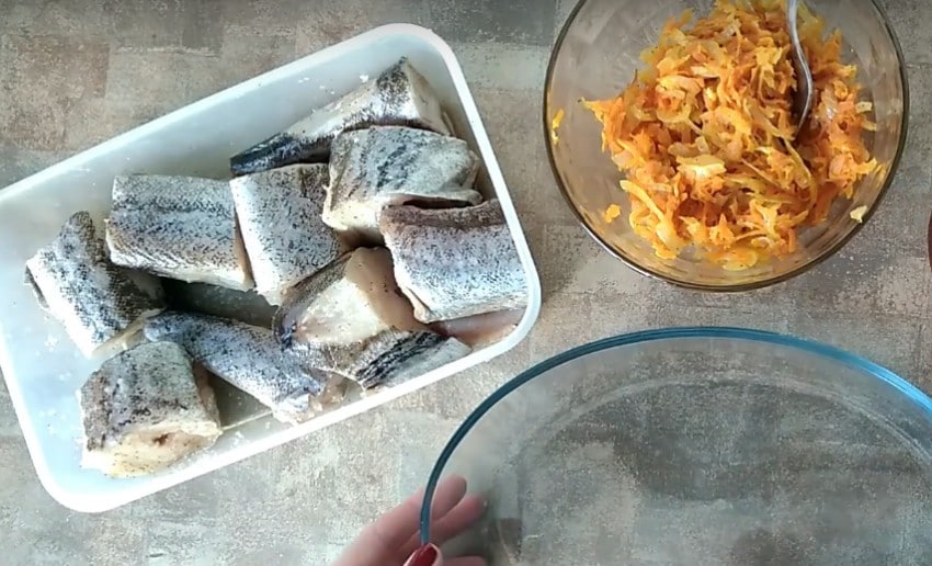 Хек, тушеный в майонезе с морковью и луком в духовке