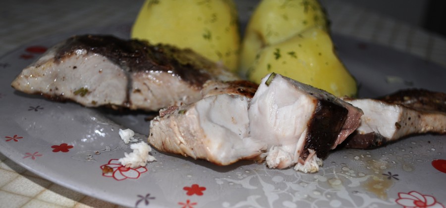 - Далее тушки чистят, потрошат, отрезают плавники и удаляют жабры. После этого их промывают и разрезают на стейки толщиной 3-4 см. Стейки натирают перцем и специями, а затем поливают маринадом, после чего ставят в закрытой ёмкости в холодильник на 2-3 часа.