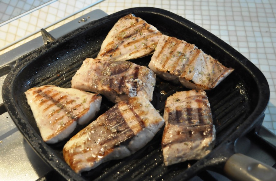 Конечно, лакедру стоит попробовать пожарить . Сделаем вид, что это стейк из “тунца”. Филе смазываем кисточкой маслом. Посолили, поперчили, присыпали розмарином, дали постаять 30 минут. Я жарила на сковороде-гриль без панировки, просто промакнула бумажной салфеткой..