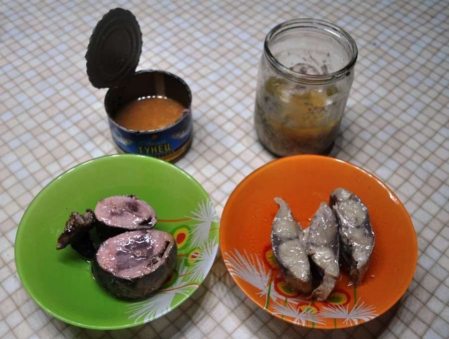 Для чистоты эксперимента я купила баночку консервов «Тунец» . На всех возможных вариантах банок в магазине было указано «тунец вьетнамский». Наша лакедра, скорее всего, корейская. Соседи. Готовые консервы выглядят так: