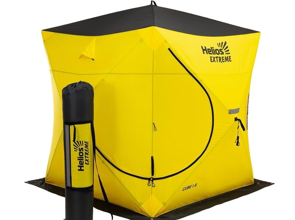 Зимние палатки для рыбалки кубы есть разных типов. Хелиос Куб 1.8х1.8 – оптимальный бюджетный вариант. У нее тент из влагостойкой, термосберегающей ткани с прозрачным PU покрытием, а также светоотражающие нашивки для обнаружения домика в темноте.