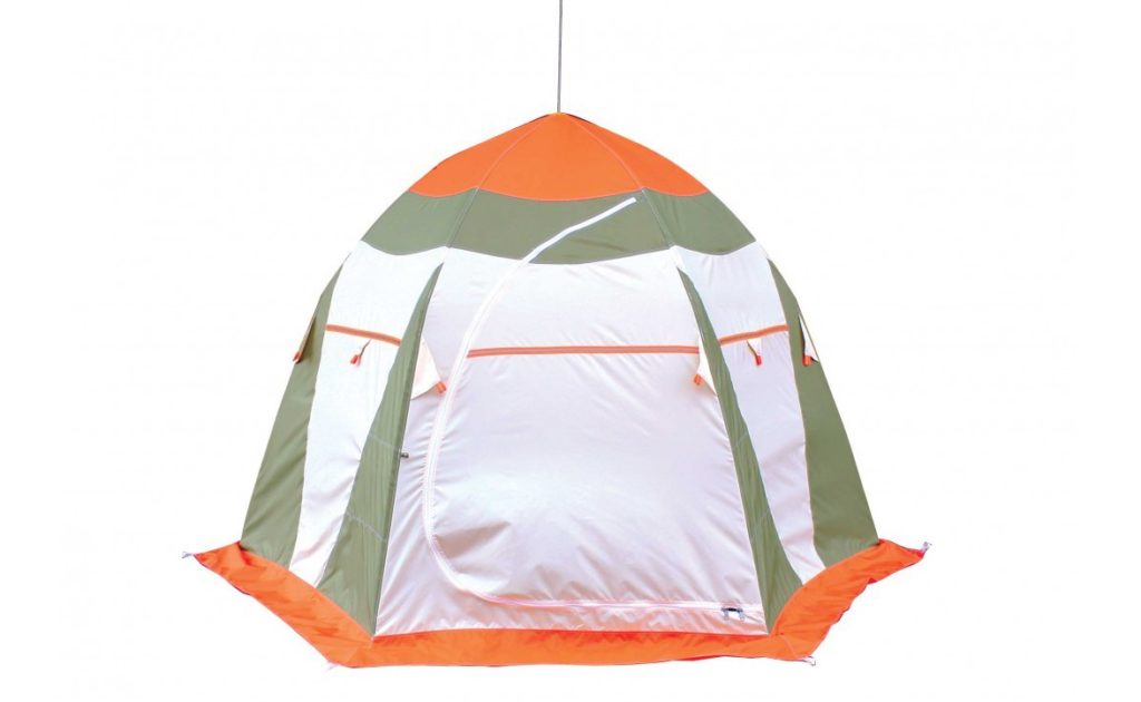 Эта палатка незаменима для зимней рыбалки на ледяной поверхности. Она в форме купола, напоминающего зонт. Эта модель раскладывается автоматически. Материал каркаса – дюралюминий. А ткань водонепроницаема. Собрать ее можно без чьей-либо помощи. Яркий оранжевый цвет вашего домика будет притягивать взгляд издалека.