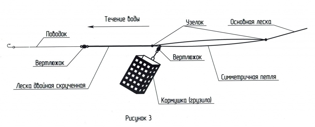 1. На выбранный отрезок шнура (лески) заводится карабин для крепления кормушки или скользящая кормушка. 2. Формируется петля. Длина петли выбирается по желанию рыболова. 3. На сложенной вдвое петле выбирается место для крепления поводка. Обычно, это половина сложенной петли, но не исключены и другие варианты. 4