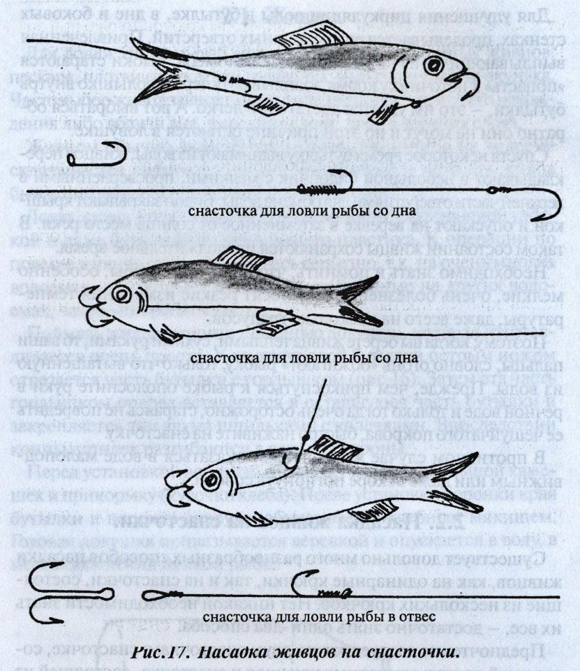 Под жабры. Леску проводят под жабры живца через рот и уже после крепят крючок. Такой способ подходит для дальних забросов, так как рыбка-насадка держится крепко.