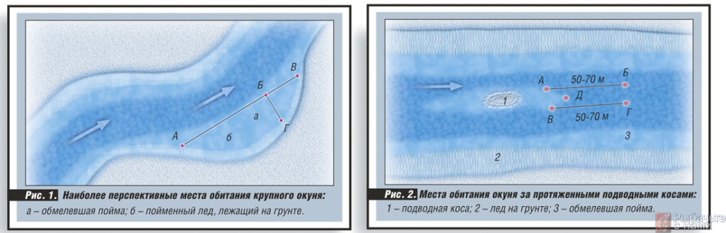 Для ловли окуня очень перспективны бровки затопленного русла. На многих старых водоемах русло замывается, заиливается и сглаживается, но там, где дно изначально жесткое, например, глинистое или каменистое и речка была достаточно глубокой и извилистой, остаются участки с выраженным руслом, с крутыми свалами и поворотами, затопленными кустами и корягами – перспективные места для крупного горбача (рис.1).