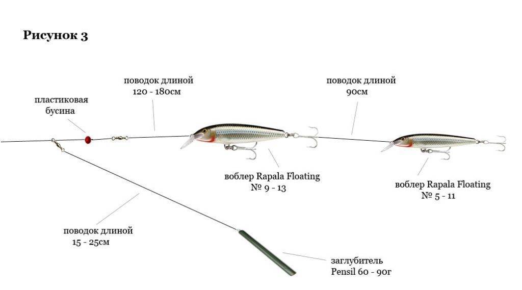 Обследовав дно, можно идти по намеченной трассе. Главное — найти место с рыбой и обловить его. Наиболее удачным будет вариант с перепадом глубины не более 2 м. В этом случае оснастки не пригодятся, ловить можно простым воблером. Но, возможно, придется делать отводной поводок или баунсер. Но опытные рыбаки обходятся безо всяких ухищрений.