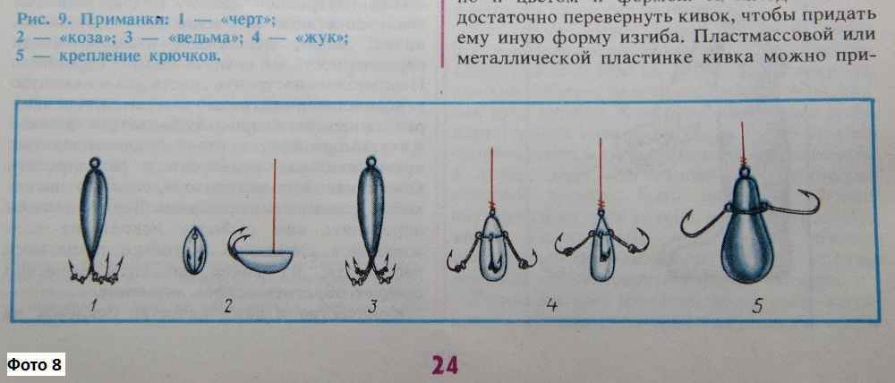 Одиночные экземпляры карасей попадались на «Чертей» и «Коз», но самый настоящий фурор в последние годы производят «Медузы» (фото 7). Кто-то считает эти «безмотылки» с тремя свободно двигающимися крючками и бусинками некой новинкой рыболовного рынка. Развею такое мнение. В сохранившемся у меня номере журнала «Рыболов» за 1990 год в статье «За окунем по перволедью» изображена приманка под названием «Жук» – аналог современной «Медузы» (фото 8). На «Жука»/ «Медузу» отлично ловится абсолютно вся речная рыба, включая такие редкие для зимы виды, как голавль, язь, линь и карась. Выходит, понадобилось почти тридцать лет, чтобы в очередной раз признать гениальность предков и поставить великолепную приманку на поток.
