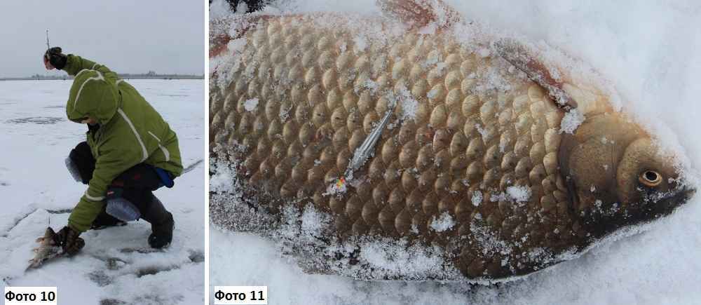 Ну и в завершении обращу внимание на два важных момента. Настраиваясь ловить карасей зимой, следует знать, что размер лунки должен быть не менее 150 мм (фото 13)