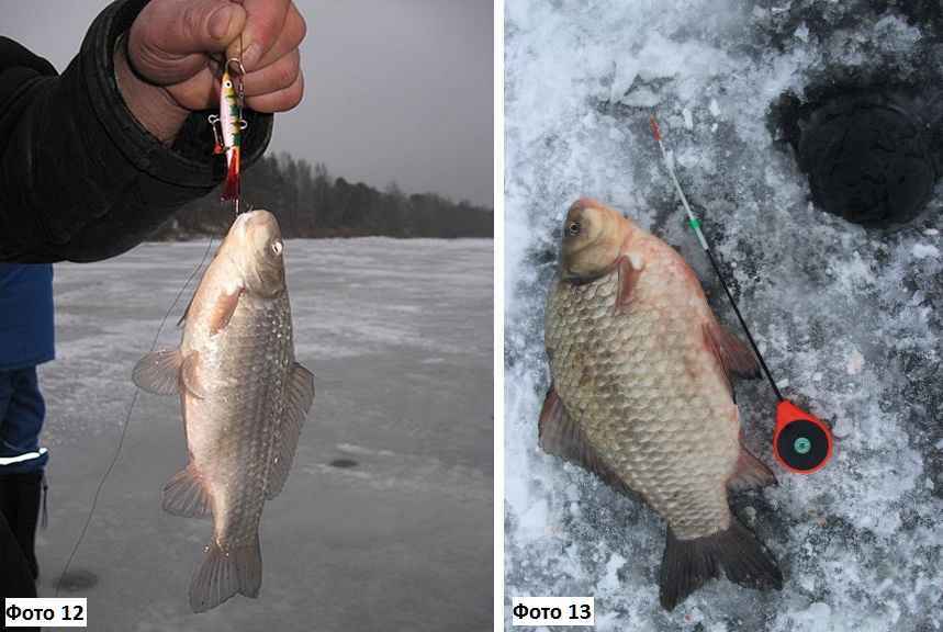 На реках, особенно в их устьях и протоках, караси периодически попадаются на некрупные балансиры длиной 25 – 50 мм (фото 12). В таких местах на них вообще хорошо ловятся многие мирные рыбы, включая крупную плотву и густеру. Причем, как и в случае с блеснами, речь о багрении рыб не идет. Полагаю, это лишний раз подчеркивает всеядность многих видов подводных обитателей. Особенно на фоне уменьшения количества корма в зимний период.