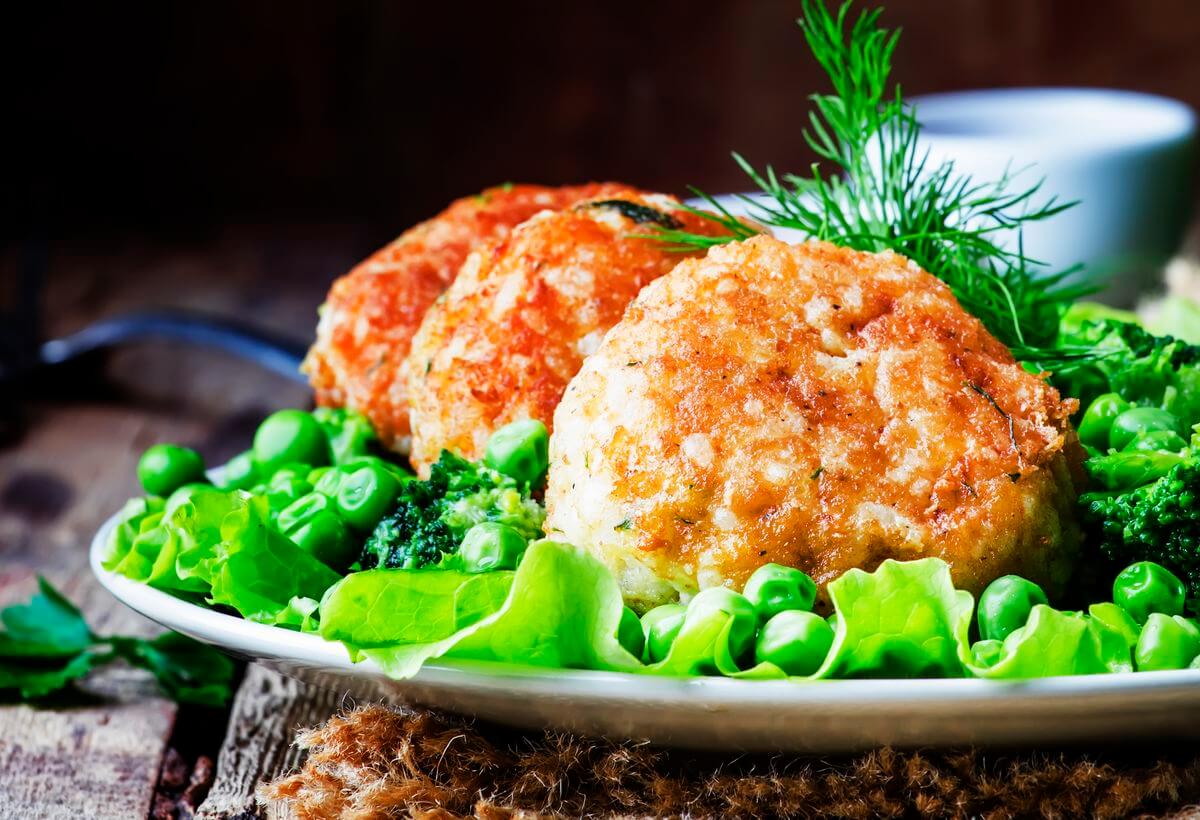 - Обед: 2 рыбных котлеты, приготовленных на сухой сковороде или на пару, запеченная цветная капуста под сыром, 2 помидора
