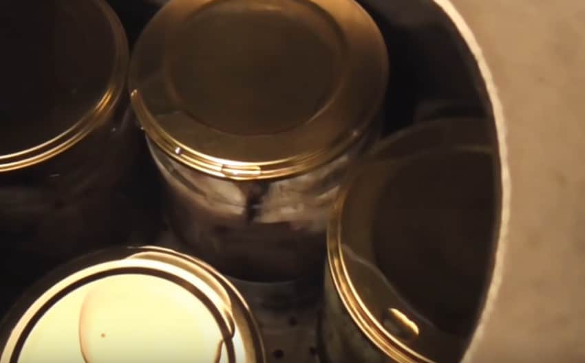 Когда консервы провели в автоклаве необходимое время, температуру в аппарате постепенно понижаем, но при этом не забываем про давление. Затем достаем банки, протираем их и убираем в холодное темное место для хранения.