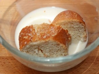 - Черствый хлеб размочите в теплом молоке или воде.