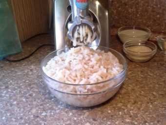 Затем филе рыбы, сало, чеснок и лук нужно отправить молоться в мясорубку.