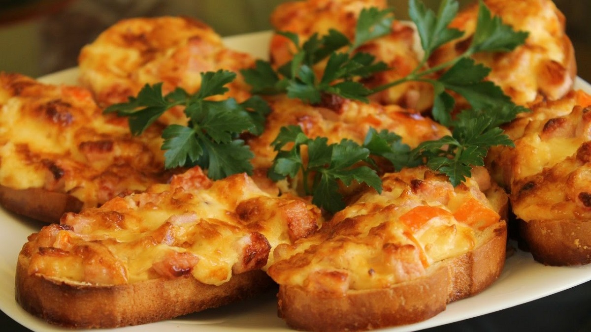 На праздничный стол можно приготовить и горячие бутерброды. Это очень сытная закуска. Такие бутерброды можно подать и в самом начале застолья.