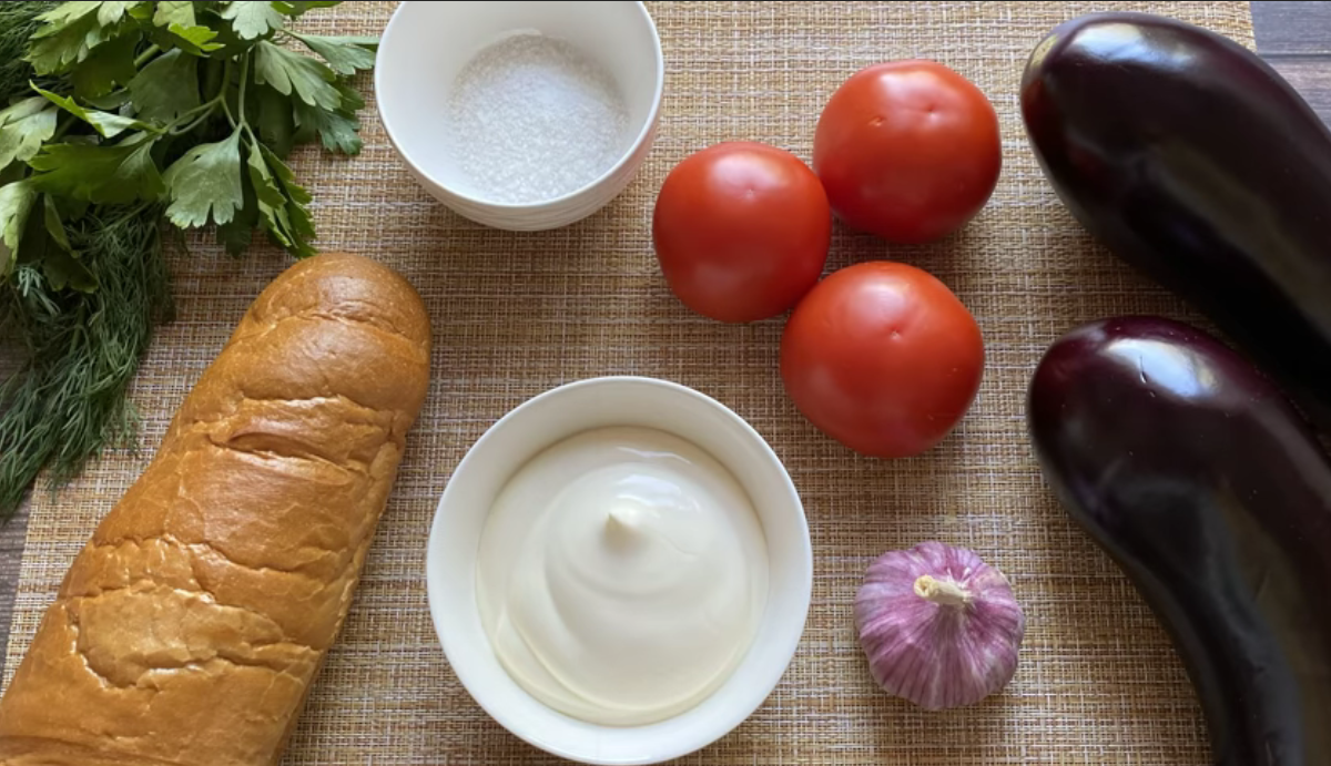 - Выложить на хлеб баклажан, а сверху расположить помидор.
