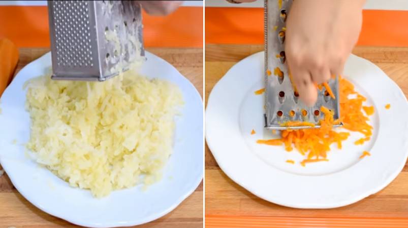 - Картофель и морковь сварите, остудите и очистите. Можно сначала почистить, а потом сварить — кому как нравится. Натрите эти овощи, каждый в отдельную тарелку, на мелкой терке.