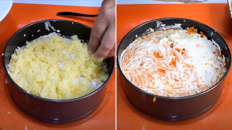 11.Сверху разложите морковь, распределите ее и смажьте небольшим количеством майонеза.