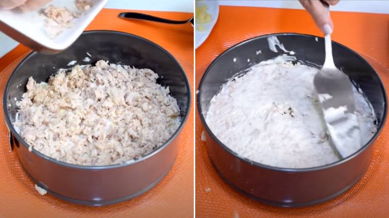9.Как вы догадались, третий «этаж» — размятая горбуша. Разровняйте ее равномерно.