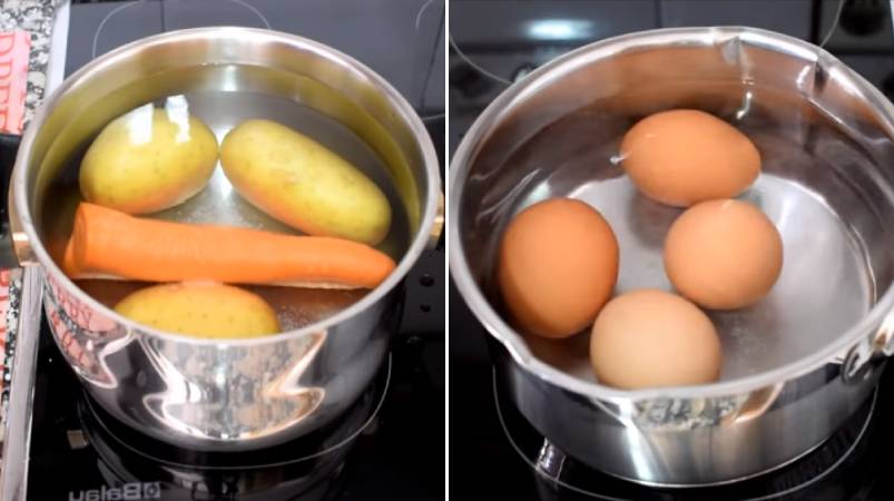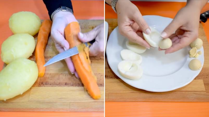 Отварите для начала овощи в кожуре (около 20 минут) и сварите вкрутую яйца