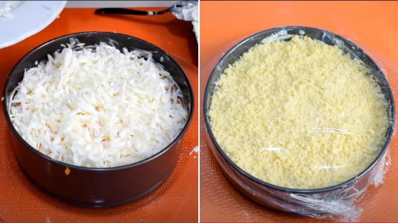 9.И завершает всю композицию — тертый желток, который и символизирует цветы, в честь которых названо блюдо. Уберите салат в холодильник для пропитки минимум на 1 час. После чего потихоньку снимите кольцо, прокручивая его.
