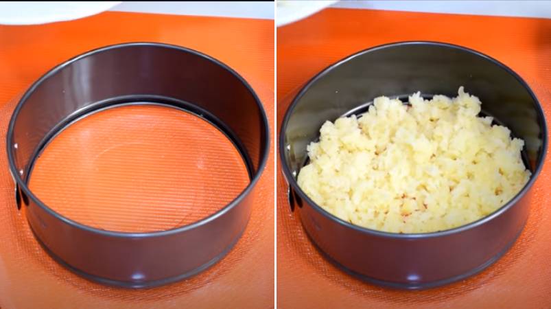 3.»Мимоза» выкладывается слоями. Красиво она будет смотреться, если воспользоваться разъемным кольцом, для этого количества продуктов диаметр — 18 см или меньше. Также по-старинке можно взять обычный прозрачный салатник.