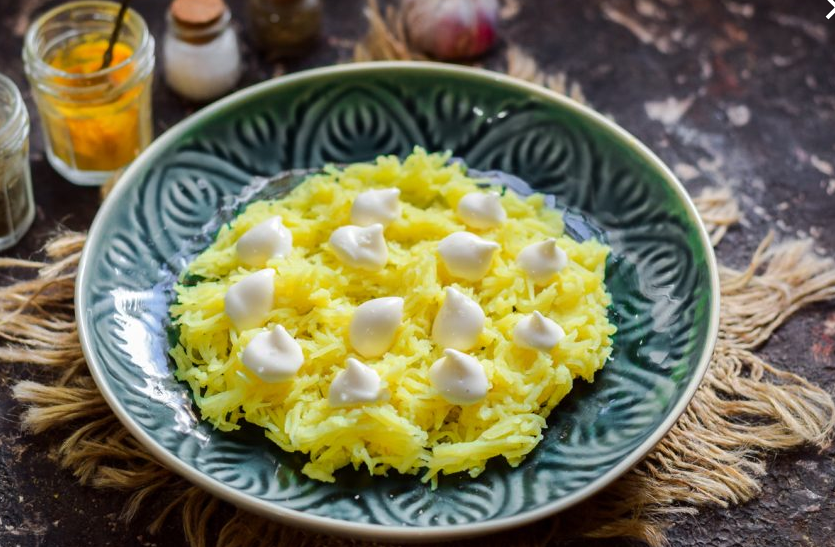 - На тарелку мелко натираем картофель, поливаем майонезом.