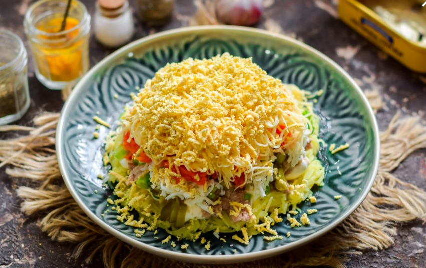 - Выкладывать салат нужно слоями: картофель, майонез, рыба, лук, майонез, морковь, майонез, яйца, майонез.