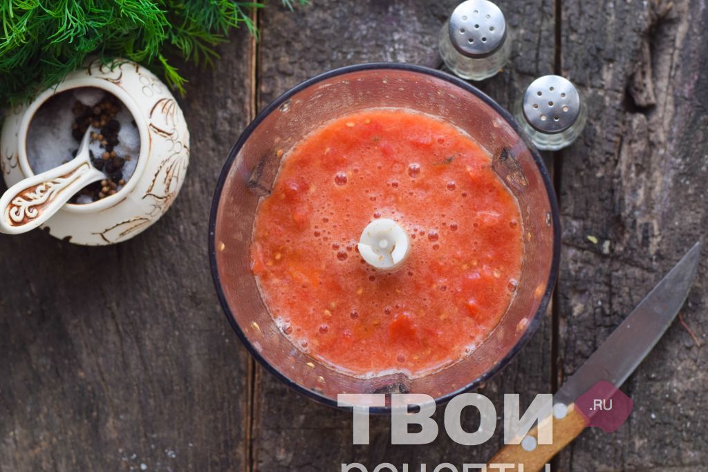 Томаты выбрать сладкие и мясистые, с тонкой кожицей. Вымыть помидоры и вырезать место роста плодоножки. Измельчить томаты в пюре, при помощи стационарного блендера или мясорубки.