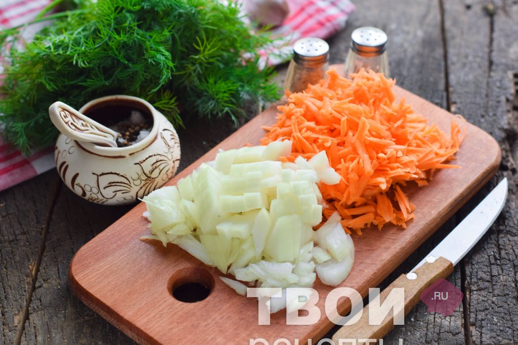 Морковь и лук очистить, вымыть. Морковь пропустить на комбайне или натереть, лук просто нашинковать. В сковороде подогреть масло, переложить овощи и поджарить пару минут.