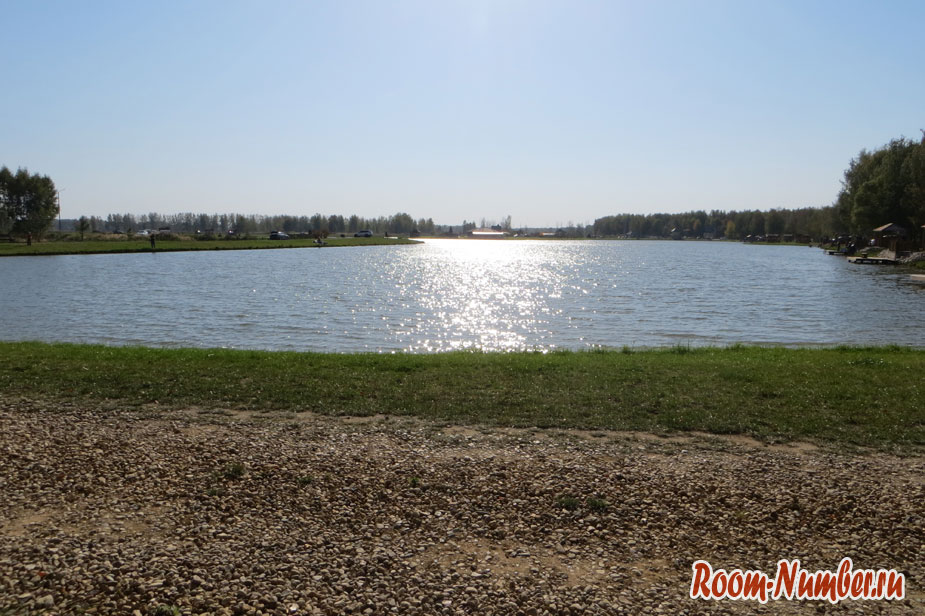 Главный пруд оказался довольно большим. На официальном сайте Ихтиолога по фото он казался меньше. Хорошо, что можно проехать на машине, а то топать пешком от парковки со всем необходимым для рыбалки и пикника было бы проблематично. Бунгало мы не бронировали, поэтому добрались до противоположного берега и разместились на травке.