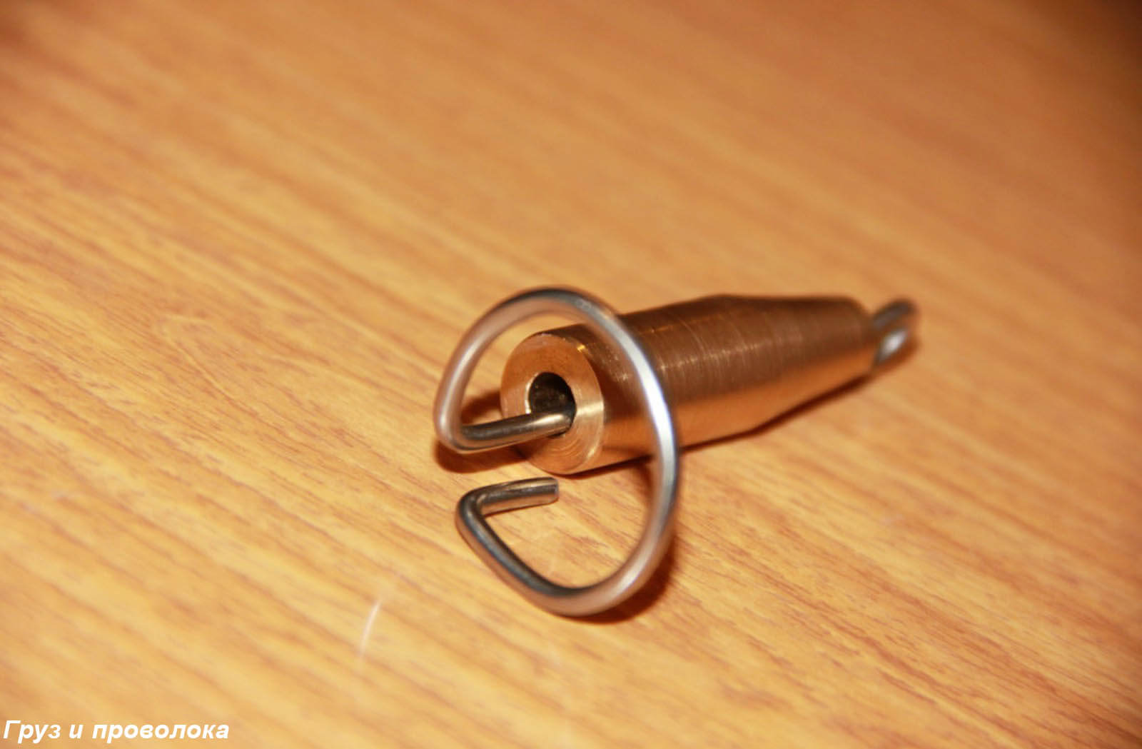 В конструкции используют проволоку средней толщины, чтобы она в согнутом виде легко двигалась по отверстию в корпусе грузила. Если диаметра отверстия недостаточно для этого, его рассверливают до нужного размера. С узкой стороны грузила формируют петельку, на широком конце делают кольцо.