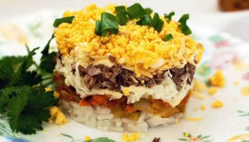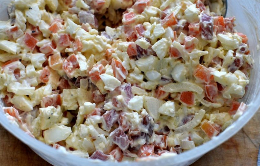 Для заправки понадобиться натереть на терке репчатый лук и смешать его с майонезом. Все ингредиенты салата выложить в одну миску, полить такой заправкой, посолить. Поперчить красным перцем и равномерно перемешать.