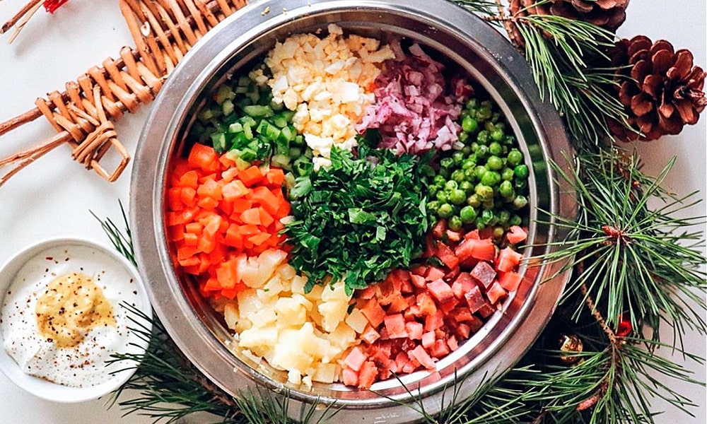 Готовят «Оливье» с горбушей, следуя традиционной схеме: