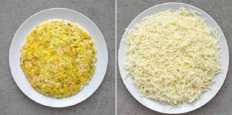 - И последний шаг – натираем на мелкой терке желтки, посыпаем ими наш салат, при этом стараемся не смешивать желток с майонезом;
