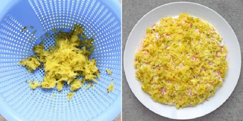 - Трем белок на мелкой терке и распределяем по верху предыдущего слоя, затем снова добавляем майонез;