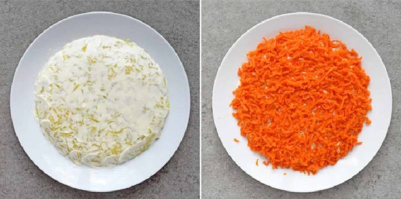 6.Третим этажом следует морковь. Присолите ее и полейте заправкой.