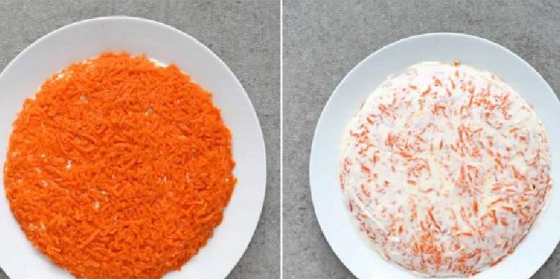 - Следующий слой – морковь. Трем ее на крупную терку, равняем и утрамбовываем все с помощью рук. Тут Вам опять поможет рецепт с фото, должно быть все так, как на снимке;