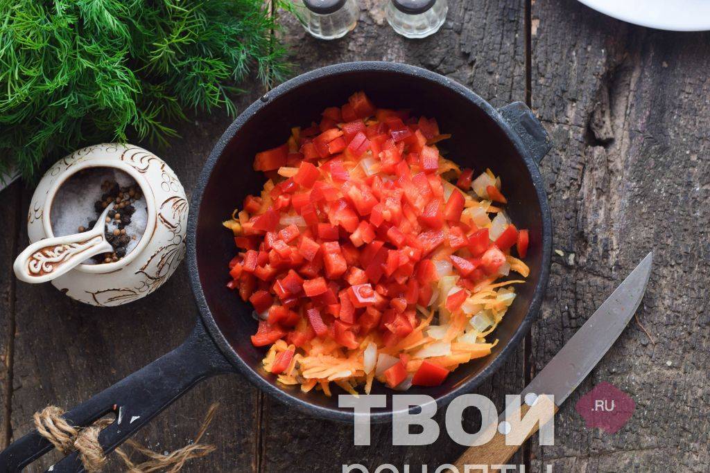 В процессе добавить болгарский перец, заранее очистив его от мембран и семян, нарезав кубиком. Вместе с перцем готовить овощи еще 5-7 минут.