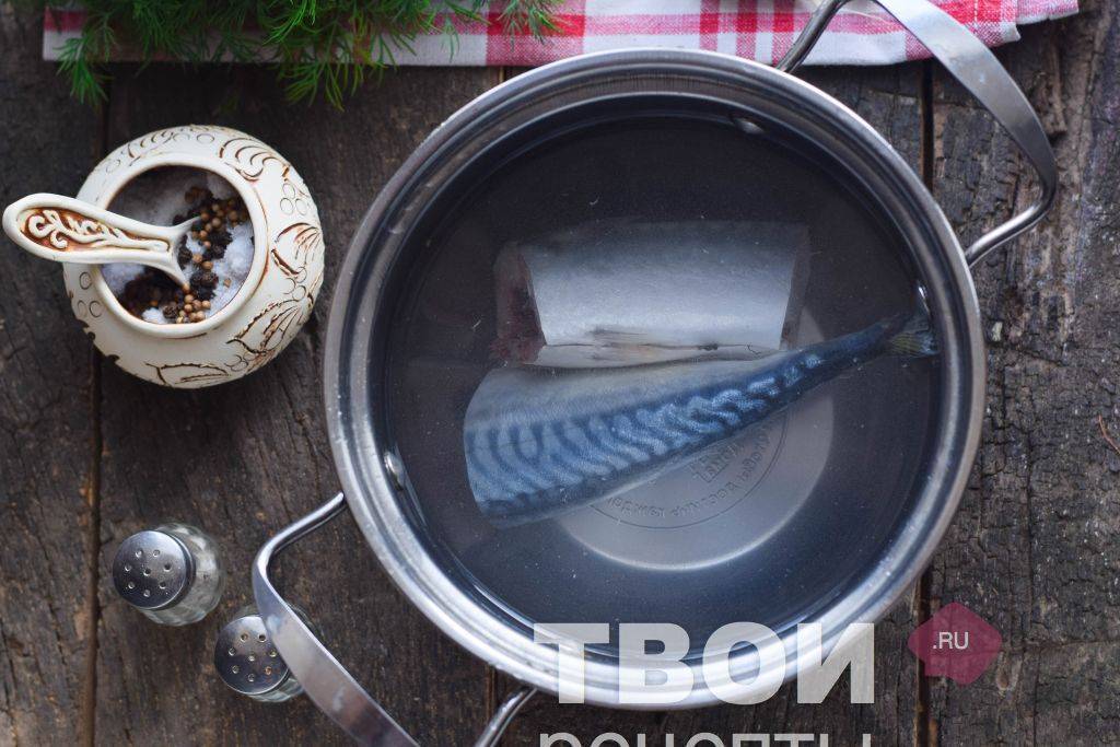 Для начала необходимо подготовить рыбу – достать из морозильной камеры, обернуть пергаментом и положить на нижнюю полку холодильника. Когда рыба оттает, очистить ее и тщательно промыть. Нарезать кусочками, сложить скумбрию в кастрюлю, залить водой, варить в течение 15 минут.