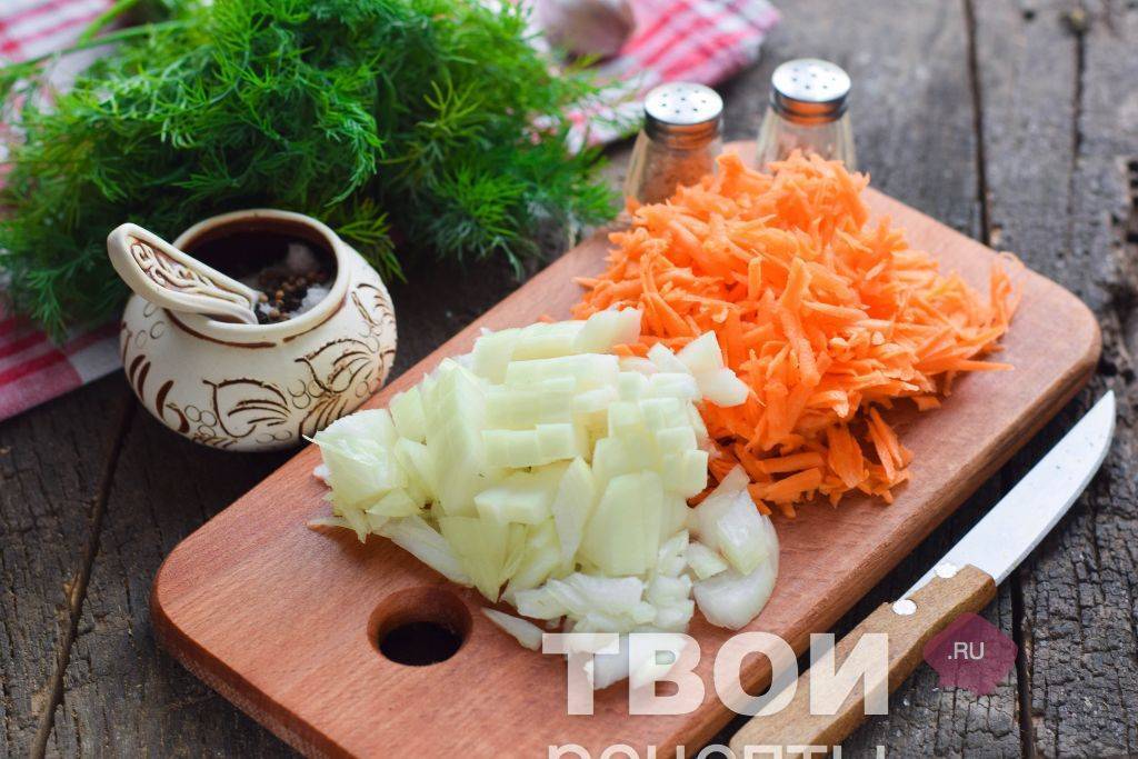 - Морковь трется на крупной терке. Мелко режется лук.
