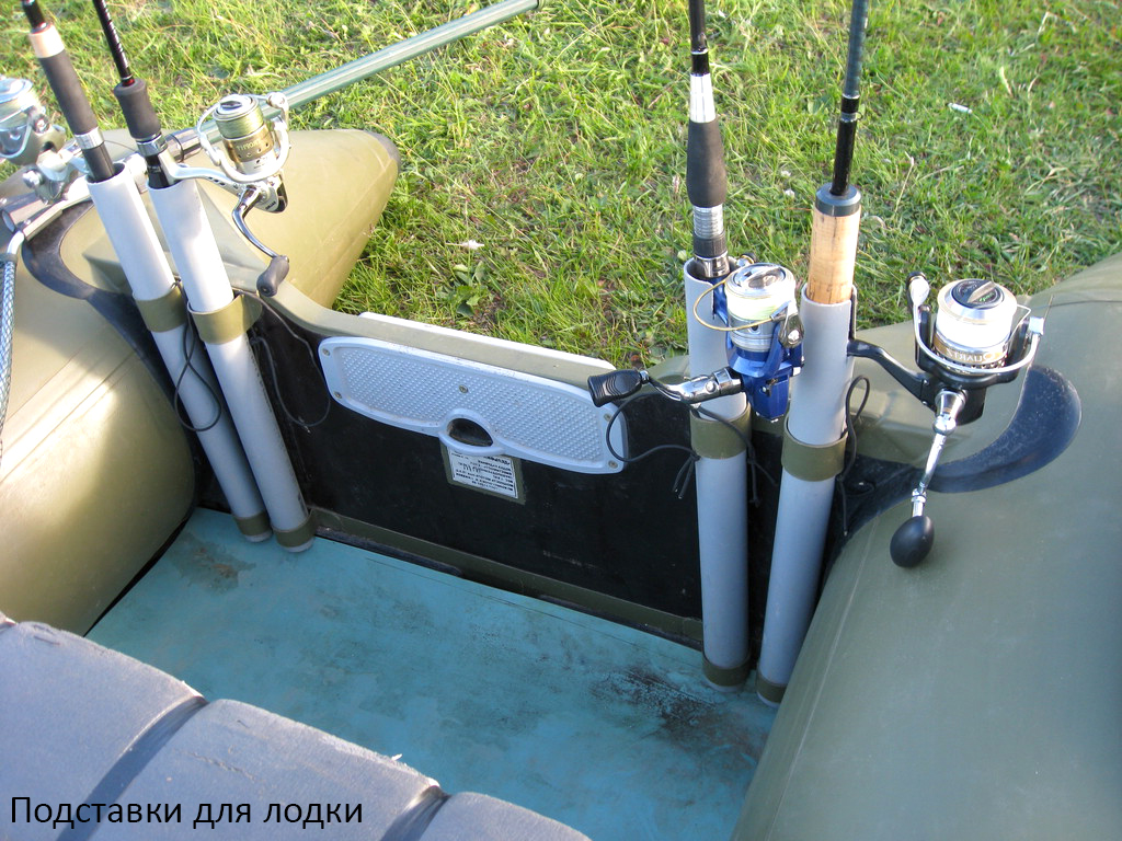 Для надувной лодки изготавливается подставка с регулировкой наклона и фиксируется в любом положении. Дополнительно конструкция оборудована задним упором для крепления удочки. Также в лодке устанавливают подставку-стакан. Он удобно закрепляет удочку во время движения лодки.